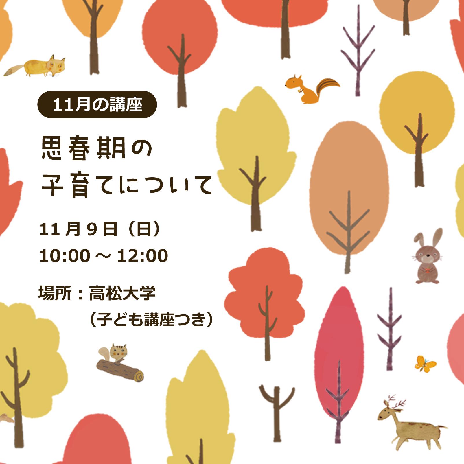 思春期の子育てで大切にしたいこと、子どもとの関わり方などについて教えていただきます。お子さんはまだ思春期に入っていないけれどという方も、大変な時期を乗り越えた方もぜひどうぞ。今回も別部屋にて高松大学・高松短期大学の学生さんのご協力のもと子ども講座を行いますよ。